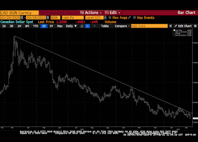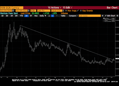 Mexican Peso: The peso fell out of favor last week, tumbling about 2.5% against the US dollar, making it the weakest currency. It fell every day last week for the first time in ten months. One of Mexico's key draws was its relatively higher interest rates, but rising global yields reduces the attractiveness. Over the past month, the US Treasury yield rose 25 bp to 1.35%, while Mexico's 10-year dollar bond yield slipped three basis points to 2.73%. The natural gas disruption emanating from Texas forced auto producers and other manufacturers in Mexico. The disruption may be severe enough to spur economists to reduce Q1 GDP forecasts when many expect the economy to be contracting. For the past three months, the dollar was mostly confined to an MXN19.55-MXN20.50 trading range. Spikes had seen around MXN20.6650 (December 2020) and nearly MXN20.60 (late January). While the US dollar has held below a similar trend line against the Canadian dollar, it has broken above it against the Mexican peso. The next target is in the MXN20.65-MXN20.70 area. The MACD has turned higher from elevated levels, while the Slow Stochastic is turning higher from the lower end of the range. Initial support may be in the MXN20.20 area.